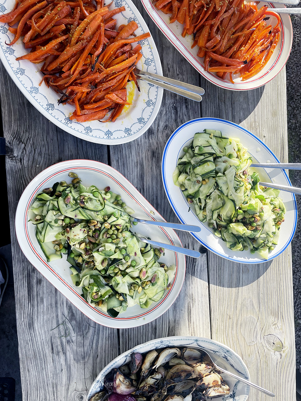 Et par gange i løbet af sommeren samler vi gæster i haven og spiser sammen til langbordsmiddage. De sidste par år har vi selv stået for maden og lavet mad, vi køber ind hos lokale grønt- og kødproducenter. Menuen afhænger af, hvilke råvarer vi kan få på det tidspunkt.